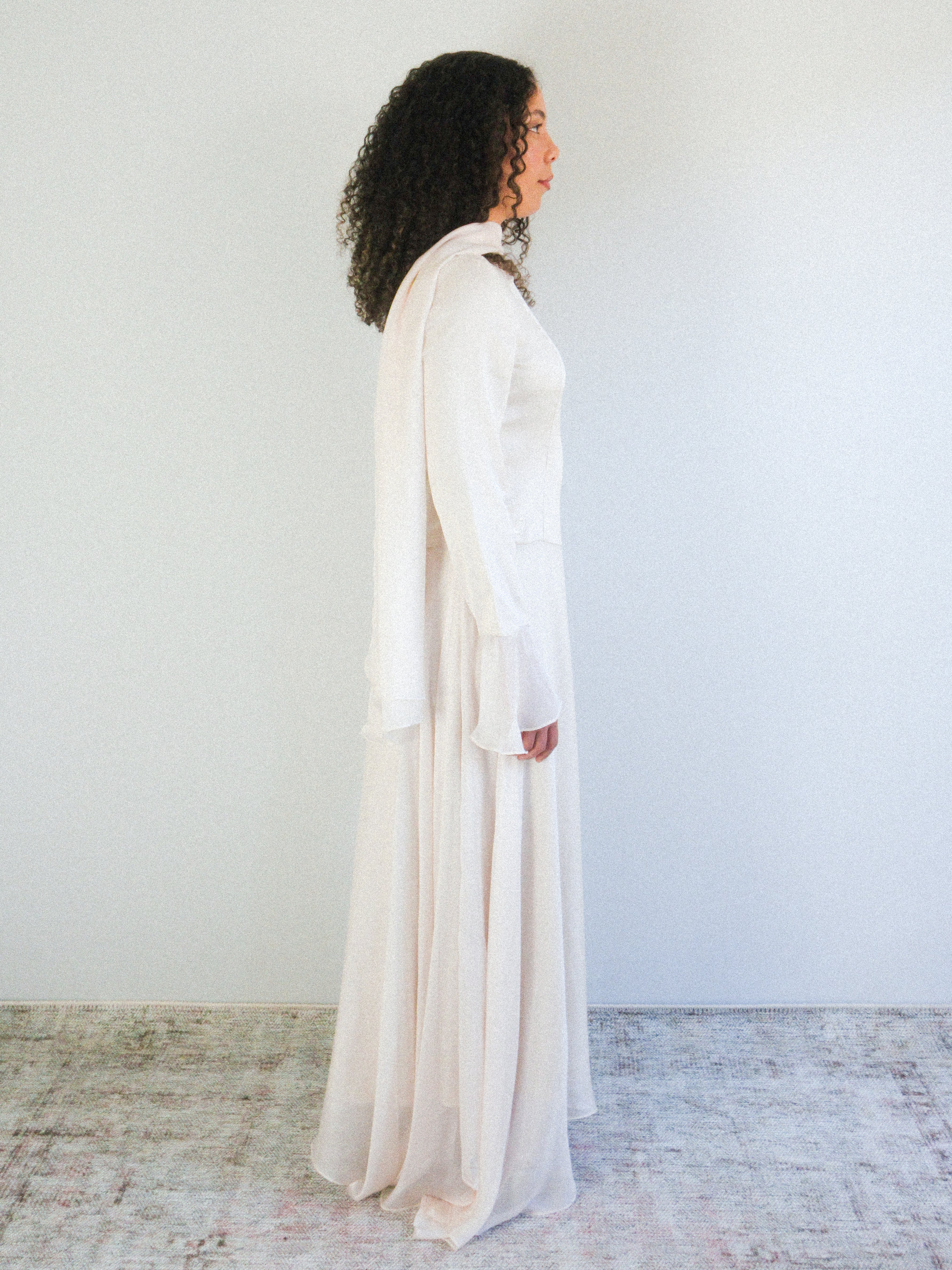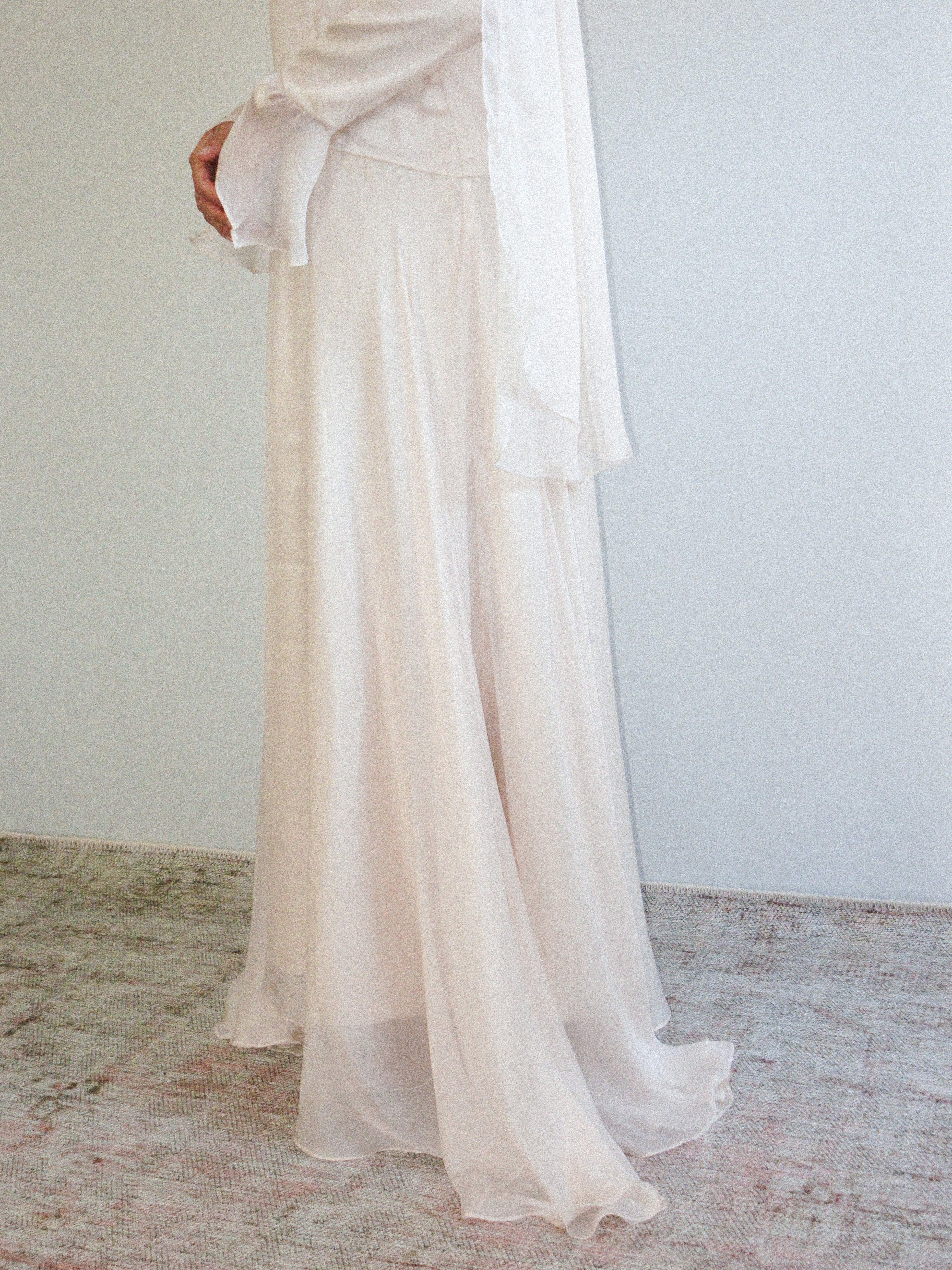Crafted from 100% silk chiffon, the dress exudes an airy, lightweight elegance with a soft, delicate drape. Fully lined with silk-like satin polyester, it offers breathable comfort and a smooth feel against the skin, ensuring all-day ease, and achieving a better fit.